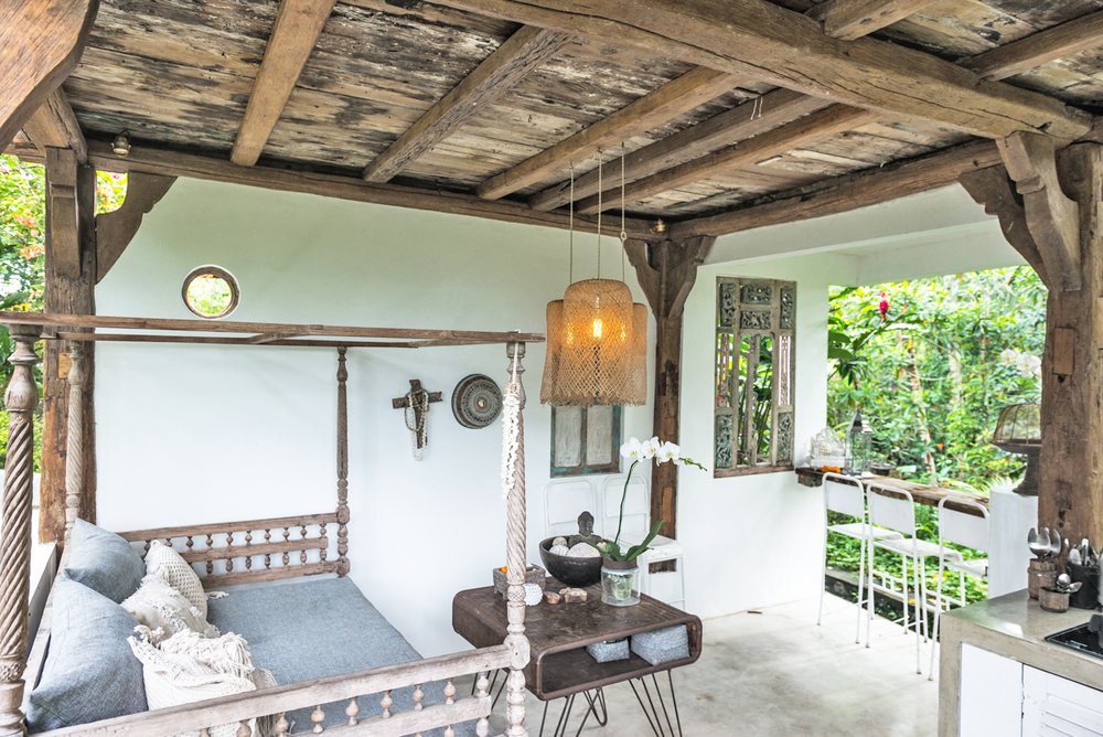 Downstairs you’ll enjoy your own living room and jungle kitchen. Furnished with a traditional Balinese daybed, a dining table with chairs, and a bar with stools for working or relaxing. From the living room, you can enjoy views of the jungle, rice paddies, and lush garden.