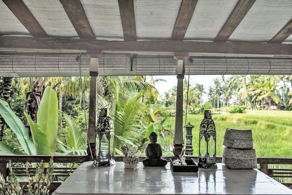 The Barn has a veranda with a mind-blowing rice field view, with a charming desk to work on and two comfortable daybeds to relax. A half-open private bathroom in the treetops with amazing jungle views.