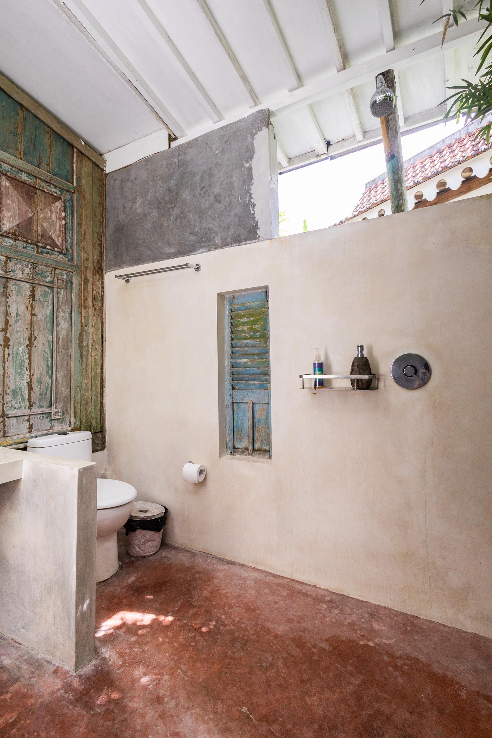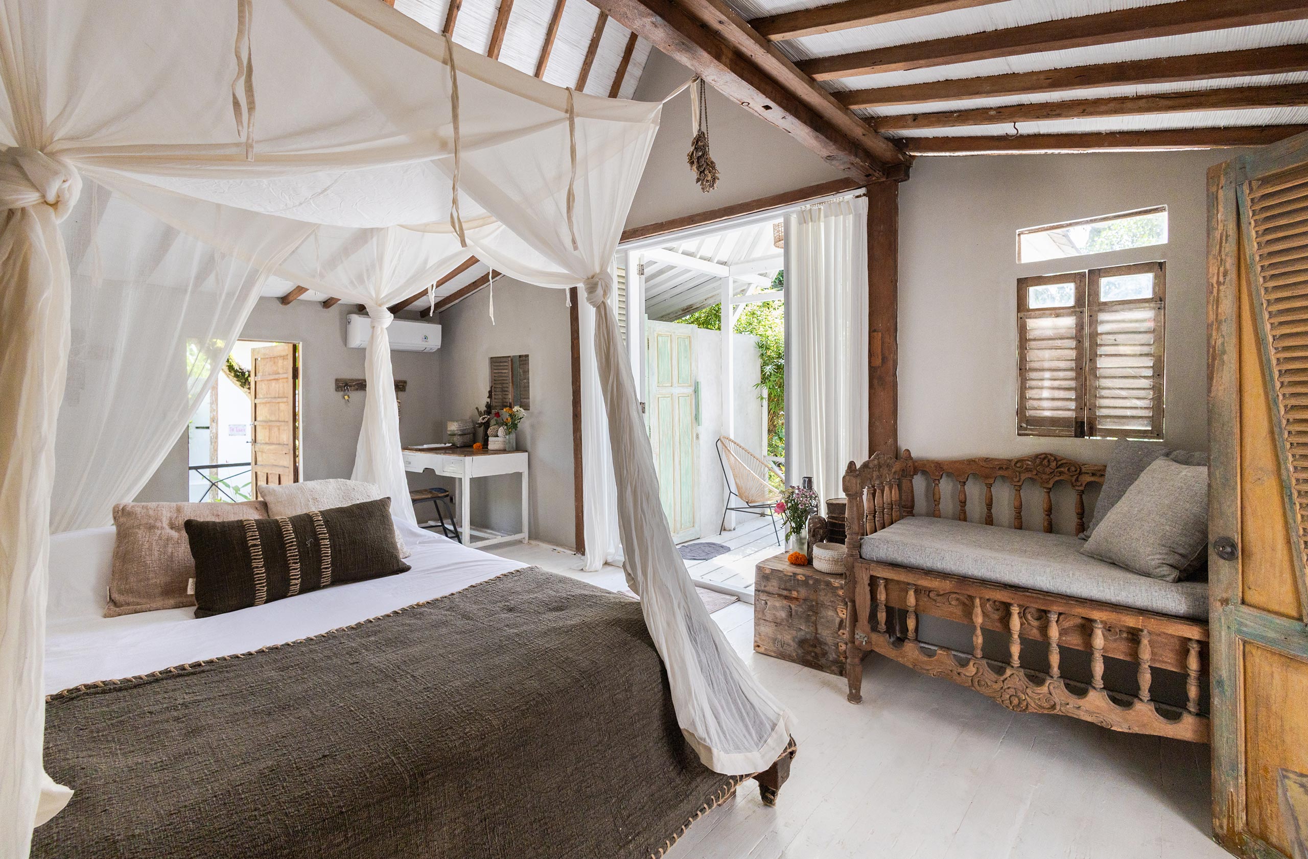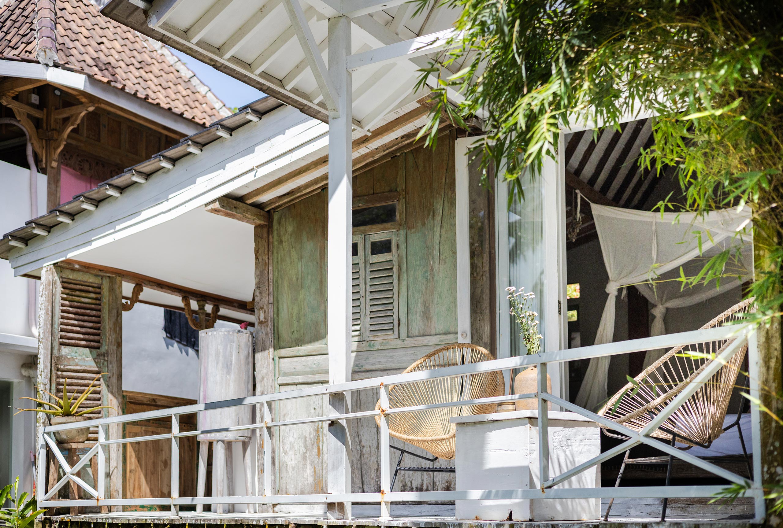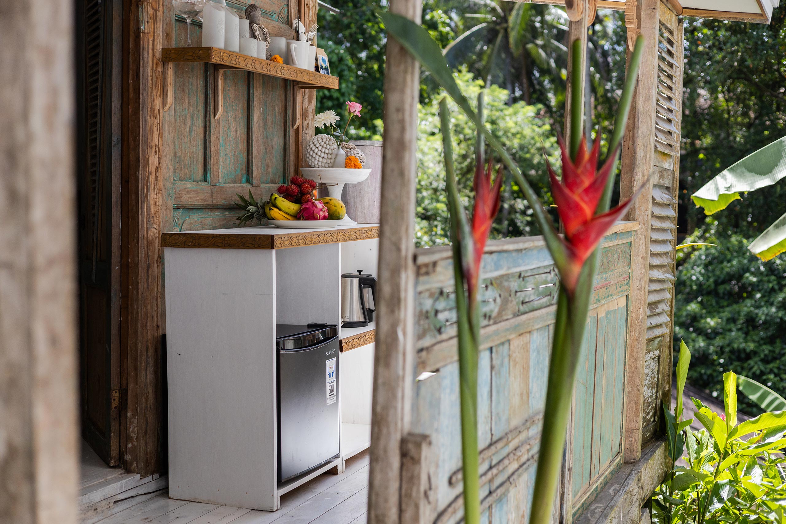 The Gladak offers one bedroom (AC) that also serves as a daybed. Outside, a small terrace and open bathroom connect you directly to the jungle below.