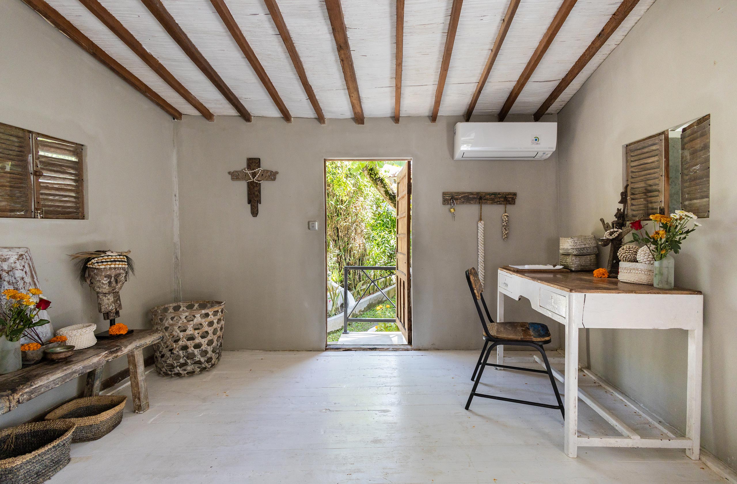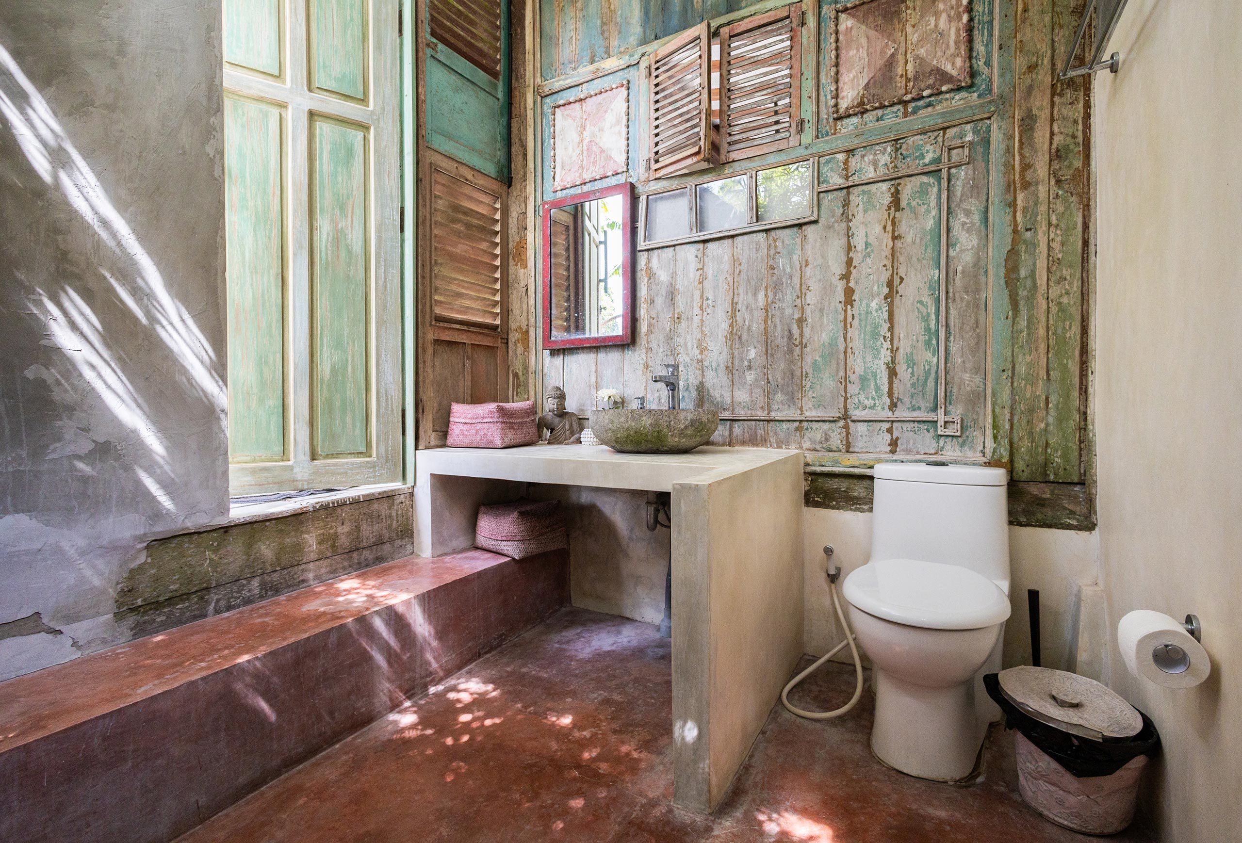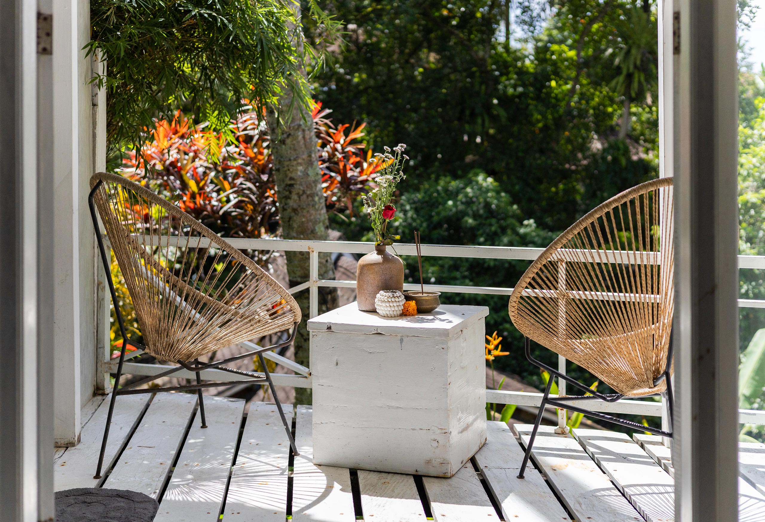 The Gladak offers one bedroom (AC) that also serves as a daybed. Outside, a small terrace and open bathroom connect you directly to the jungle below.