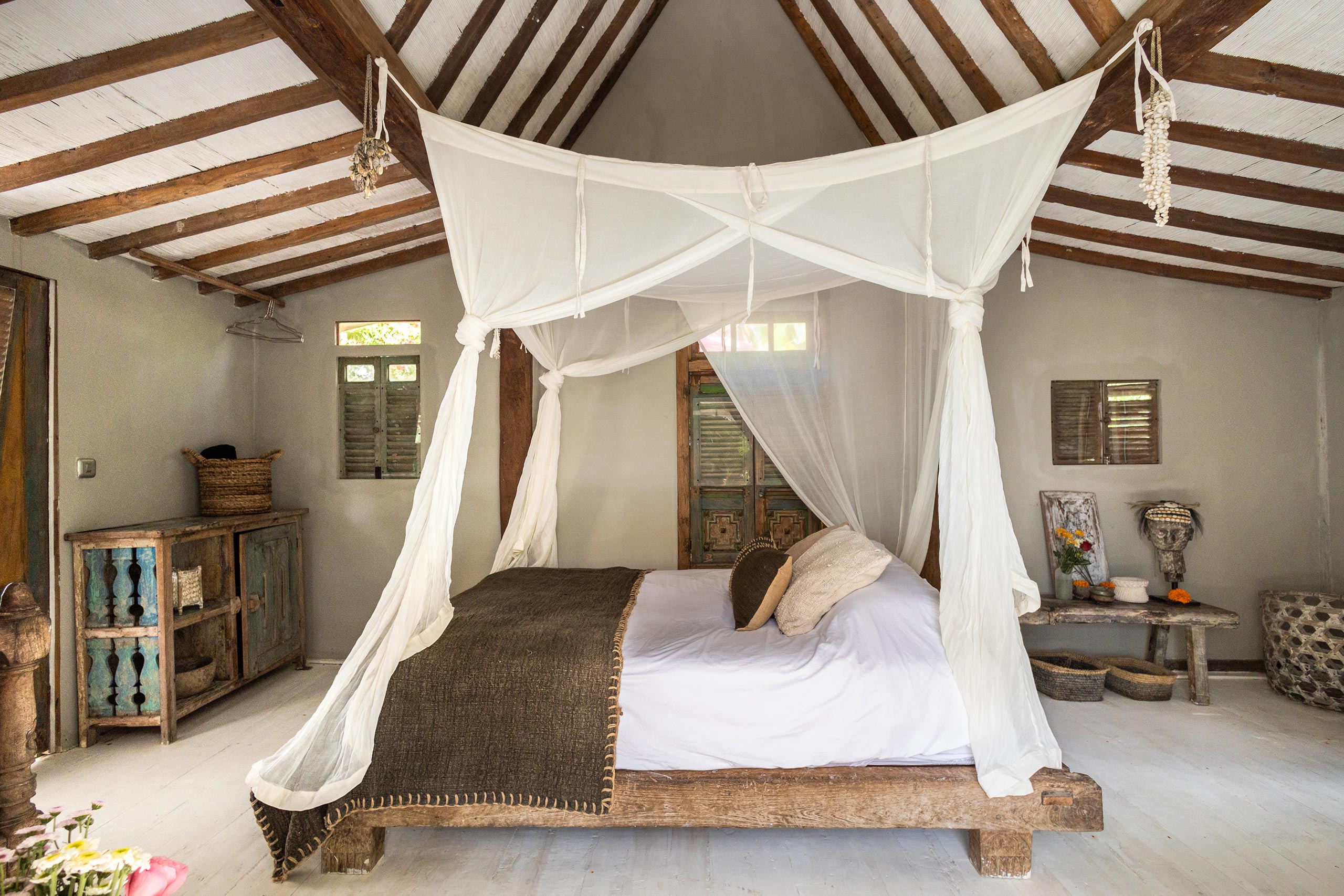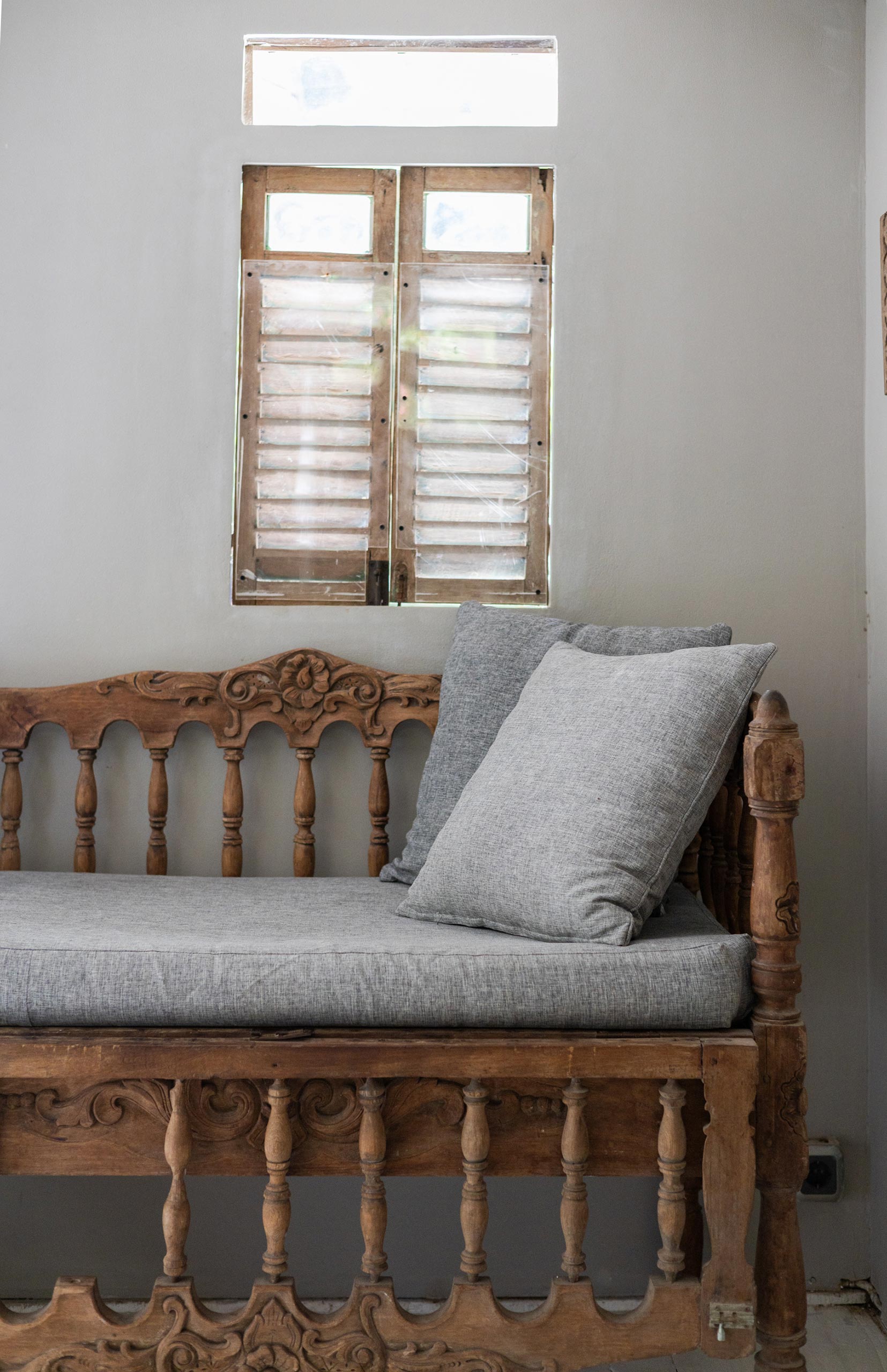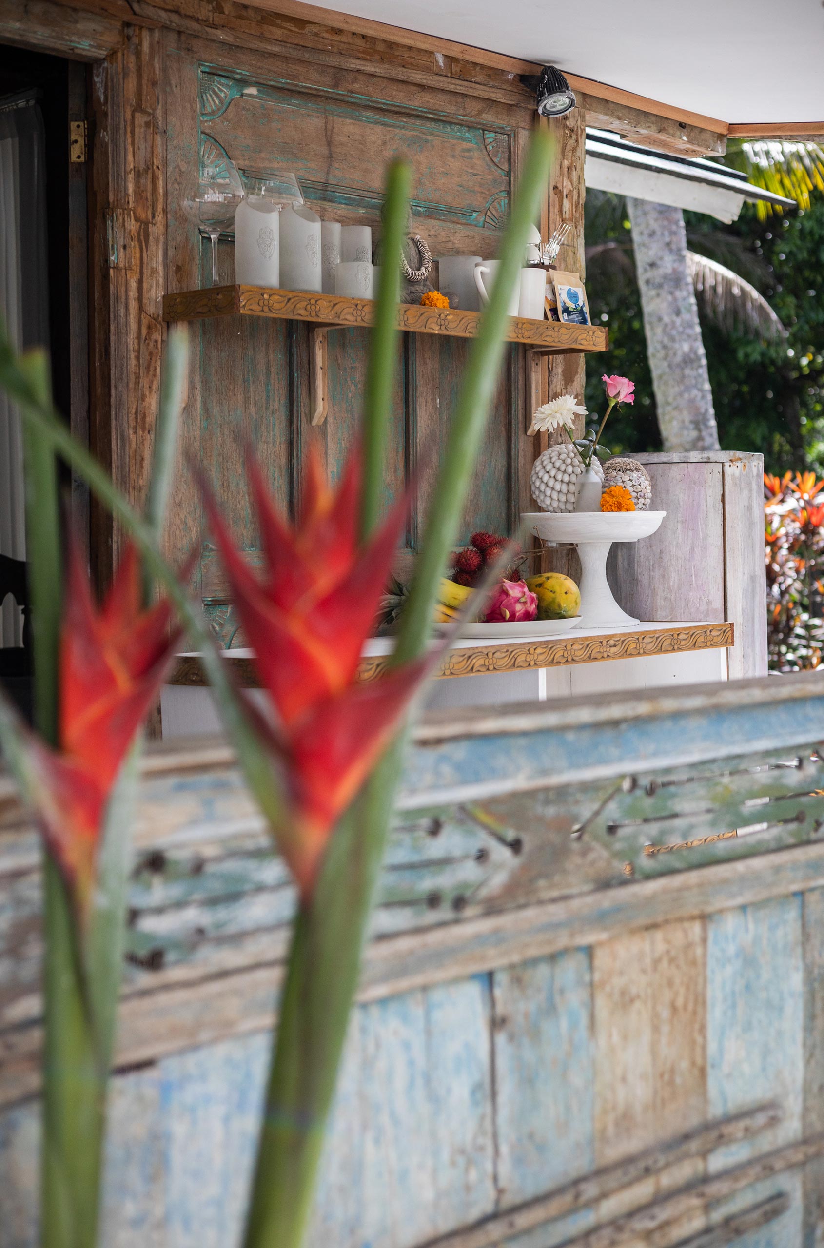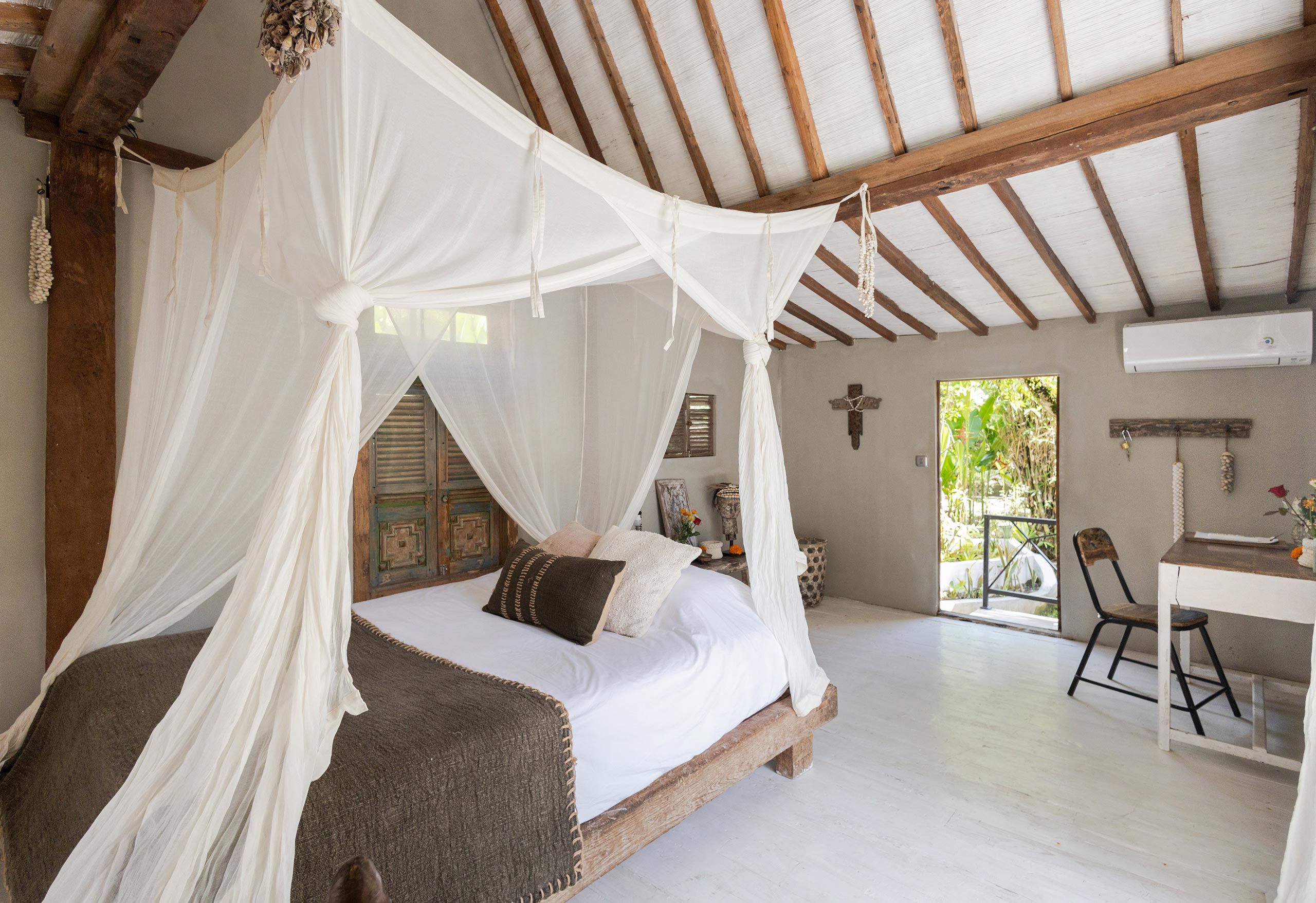 The Gladak offers one bedroom (AC) that also serves as a daybed. Outside, a small terrace and open bathroom connect you directly to the jungle below.